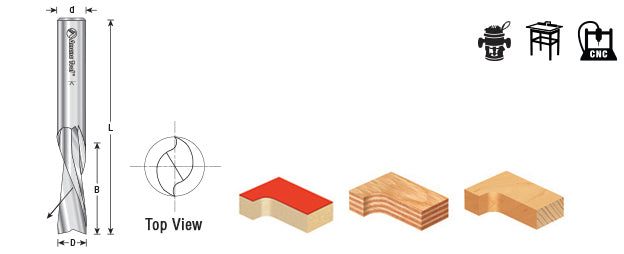 Special unique carbide grade increased clearance geometry and razor-sharp cutting edges with polished flutes provide a superior finish and longer tool life especially in abrasive materials. Great for production settings and excellent for creating grooves and dado cuts in particleboard, plywood and laminate. Primarily used on CNC machines and other automatic routers. Can be used with handheld and table-mounted portable routers.