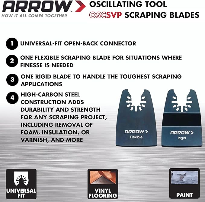 - Scraping Projects Made Easy: Arrow Scraping Blades are a must-have item for a professional or home improvement jobs; These oscillating tool blades are perfect for removing a variety of materials, including vinyl flooring, carpet, caulk, sealant, or paint