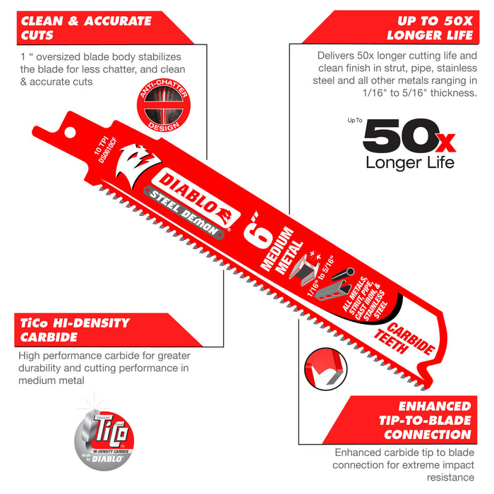 Diablo's Steel Demon™ Carbide Teeth Reciprocating Saw Blades for Medium Metal are the first carbide teeth blades on the market designed specifically for cutting medium metals and high strength alloys. This high performance carbide blade delivers an unmatched up to 50X longer cutting life than standard bi-metal blades in medium metal cutting applications. The blade's 10 TPI provides cleaner and smoother cuts on material between 1/16" to 5/16". An oversized 1" blade body height produces straighter cuts with less vibration.
