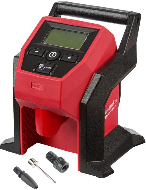 The Milwaukee M12 Compact Inflator delivers fast, accurate, easy inflation with the portability to take anywhere. With the capability to complete demanding applications like car, LT truck, and compact equipment tires, the M12 Compact Inflator gives users ultimate power and efficiency. Rated to deliver over 120PSI, The high efficiency motor and pump top-off car tires in under 1 minute. The TrueFill Auto shut-off technology delivers highly accurate pressure, protects from overfill, and automatically senses speed of fill to deliver precise shut-off at the desired PSI. Additionally, the unit includes a large easy to read back-lit LCD, anti-vibration feet, and 26" inch hose with an all brass Schrader chuck.