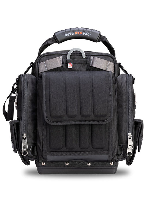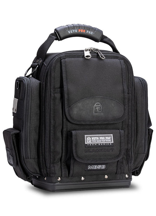 The MB5B Blackout is an all-black extra-large and highly configurable front accessed meter bag. Once the bag is loaded out, it can be worn over both shoulders using the included backpack straps, over a single shoulder using the optional padded shoulder strap (sold separately), or at your side with over-molded gripped handle. The bag includes Veto's proprietary V-SWAP interchangeable panel system and comes with the large side pocket inserts, the front tool panel, and the rear tool panel. The bag features an additional 8 pockets on the front flap as well as a padded tablet computer pocket on the back. The MB5B Blackout stores a variety of hand tools inside the bag while separately storing 1-2 clamp meters in the 2 padded side mounted zippered pockets.