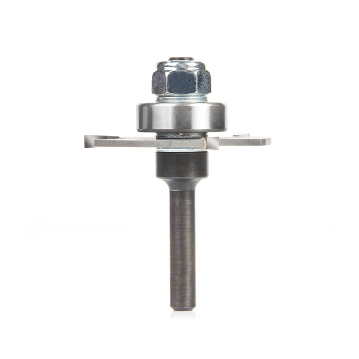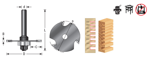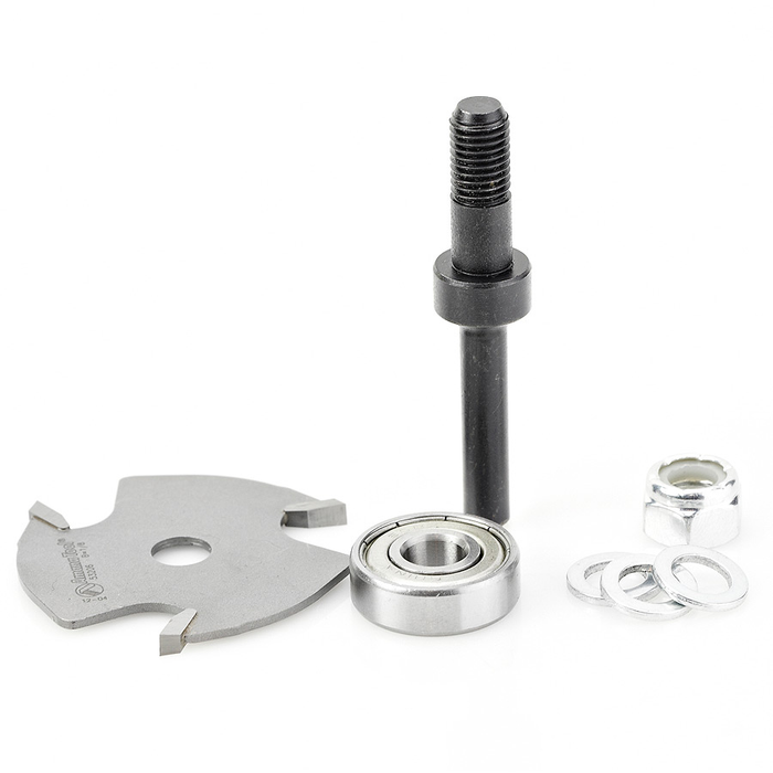 Groove edges for T-moldings, splines or biscuits, and other purposes. Rout tongue-and-groove joinery. Slotting cutters are available with either 2-wing or 3-wing cutters. Each assembly includes a cutter, bearing for a 1/2" deep cut, and either a 1/4", 3/8", or 1/2" shank arbor. Use in a handheld or table-mounted router. All assemblies include cutter, arbor and ball bearing.
