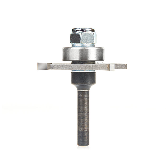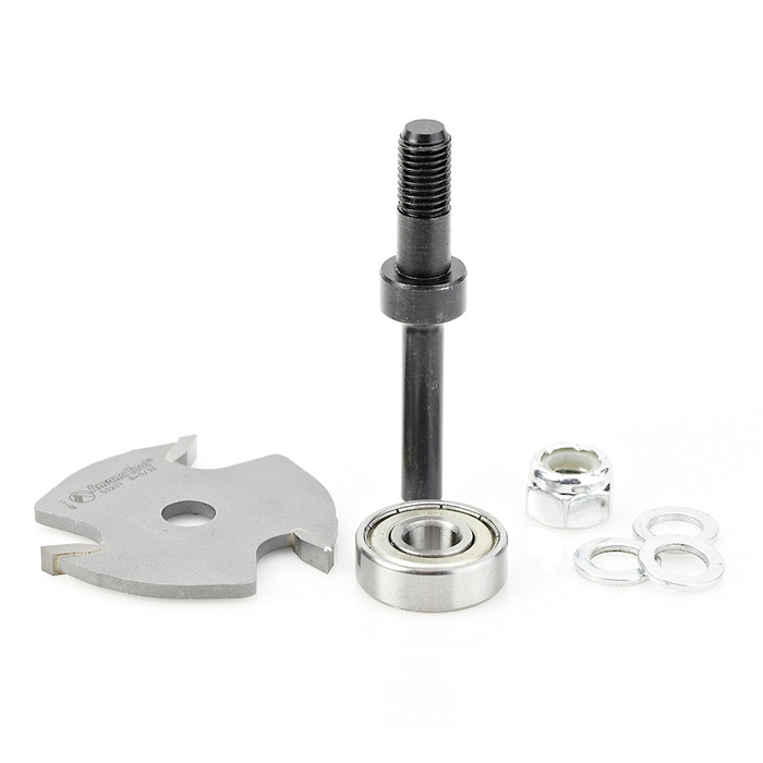 Groove edges for T-moldings, splines or biscuits, and other purposes. Rout tongue-and-groove joinery. Slotting cutters are available with either 2-wing or 3-wing cutters. Each assembly includes a cutter, bearing for a 1/2" deep cut, and either a 1/4", 3/8", or 1/2" shank arbor. Use in a handheld or table-mounted router. All assemblies include cutter, arbor and ball bearing.