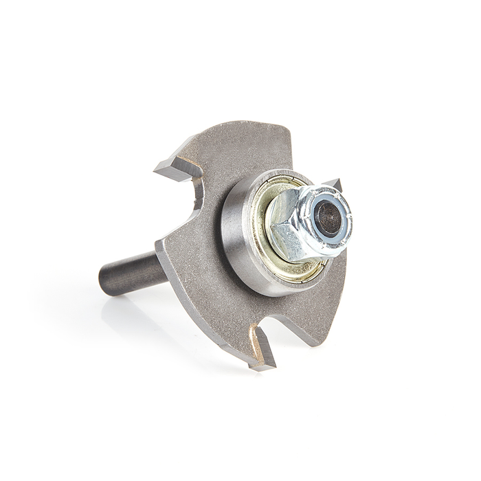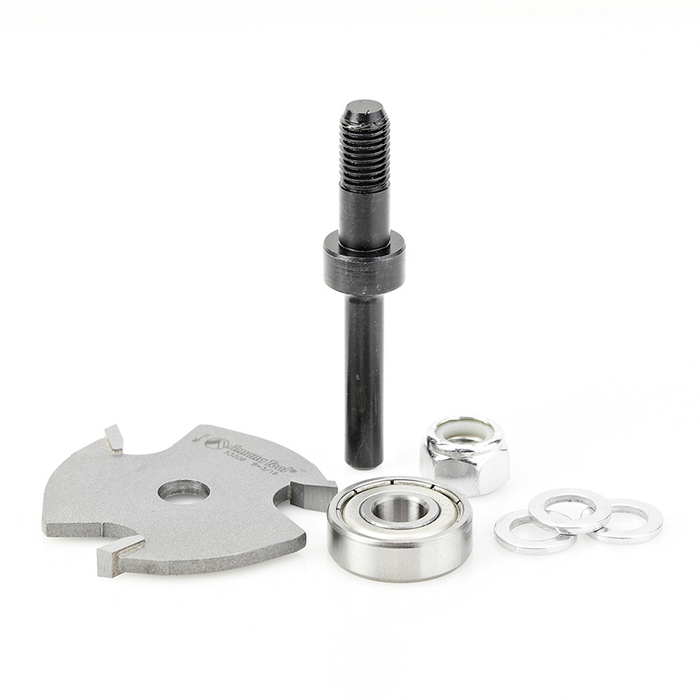 Groove edges for T-moldings, splines or biscuits, and other purposes. Rout tongue-and-groove joinery. Slotting cutters are available with either 2-wing or 3-wing cutters. Each assembly includes a cutter, bearing for a 1/2" deep cut, and either a 1/4", 3/8", or 1/2" shank arbor. Use in a handheld or table-mounted router. All assemblies include cutter, arbor and ball bearing.