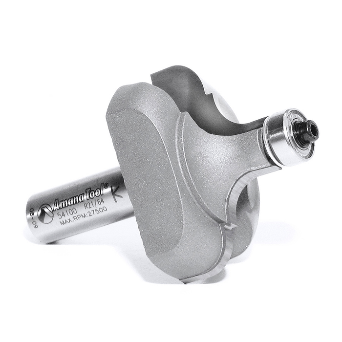 The positions of the bead and the cove are reversed on this series of bits, with the bead coming off the bearing. With the optional 3/8" pilot bearing, the bit produces a fillet at the base of the bead. Largest diameter bits should be run at reduced speed. Use in a handheld or table-mounted router.