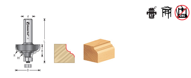 The positions of the bead and the cove are reversed on this series of bits, with the bead coming off the bearing. With the optional 3/8" pilot bearing, the bit produces a fillet at the base of the bead. Largest diameter bits should be run at reduced speed. Use in a handheld or table-mounted router.