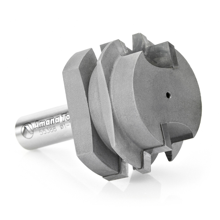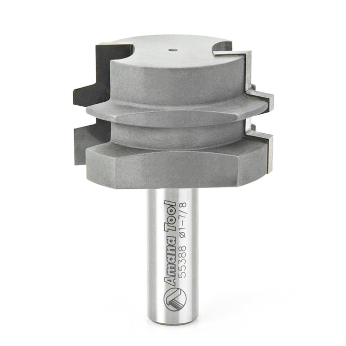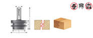 The lock miter is an interlocking edge-to-edge joint, typically used at the corners of casework. Used in a table-mounted router, run at reduced speed, this bit cuts both halves of the joint. The same setup of bit and fence cuts both parts. One part is laid flat on the tabletop and fed across the cutter. The second is braced vertically against the fence and fed across the cutter. For best results use in a table-mounted router.