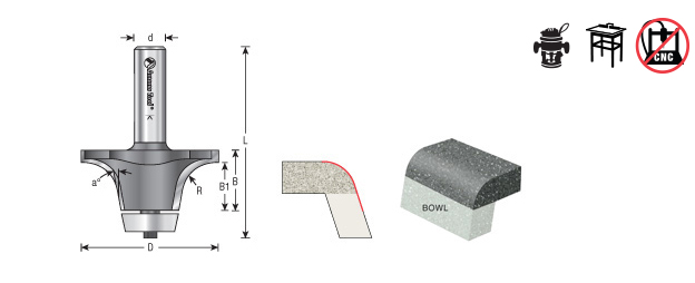 These bits prepare and/or finish counter-top edges in conjunction with undermount bowl installations. The roundover and ogee bits trim and profile the counter-top edges after the bowl is mounted. The bevel bit trims the sink cut-out flush with an installed undermount bowl, but it also can be used with a template to prepare a sink cut-out for a bevel-mount bowl. All these tools can be used for undermount applications of Corian® sink and bowl #'s 802S, 804S, 805S, 809S, and 871S.