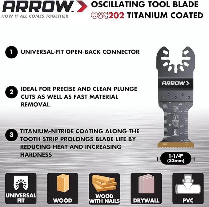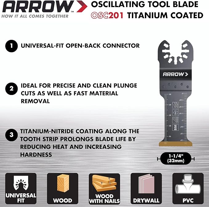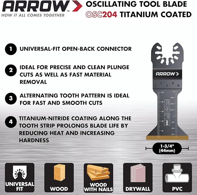 - Cutting Projects Made Easy: Arrow Titanium Coated Bi-Metal Oscillating Blades are a must-have item for any professional workshop or DIY-er toolbox; These oscillating tool blades are perfect for projects involving Metal, Wood, Wood with Nails, PVC, Copper Pipe, Drywall