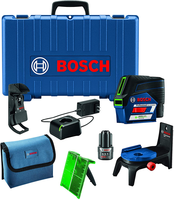The Bosch GCL100-80CG 12 V Max Green-Beam Connected Cross-Line Laser with Plumb Points delivers all-in-one versatility, with highly visible lines and points. They provide horizontal level, vertical alignment and plumb point transfer applications. The tool features Bosch-exclusive VisiMax technology, which monitors tool temperature and power consumption to deliver the brightest line for the job. The laser projects visible green lines up to 100 Ft., which are up to 4X brighter than standard red beams. The laser features Bosch 12 V Max Lithium-ion power for extended laser runtime during complex or all day layout jobs, provides a visible range of 100 Ft. and can work with an optional Bosch laser receiver to extend that range to 165 Ft. The Smart Pendulum System self-levels up to ±4¡, indicates out-of-level condition and locks for safe tool transport. The manual mode locks lines for use at any angle. The laser comes with the RM 2 Magnetic Rotating Mount that rotates 360¡, has a micro-fine adjustment knob and includes a ceiling grid clip.