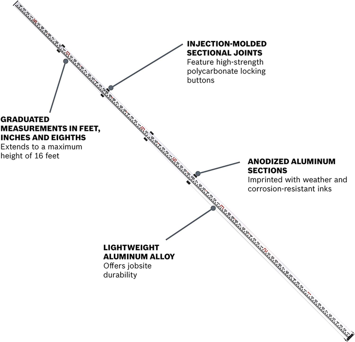 Bosch's 16' Telescoping Leveling Aluminum Rods are made of a light and durable aluminum alloy. The anodized sections are imprinted with special weather resistant and corrosion resistant inks. Tight tolerances on extruded aluminum sections allow for smooth extension and prevent unnecessary clattering and sloppiness. The sectional joints are injection molded from a durable lightweight impact-resistant plastic. Rods are equipped with reliable and wear-resistant polycarbonate buttons that lock each section. Easy-to-read graduations and a special measuring scale on the backside permit users to read height at eye level.