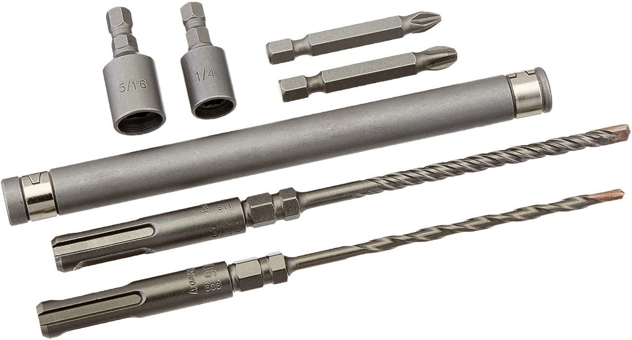 7 pc anchor drive installation kit: 5/32" x 6-1/2" and 3/16" x 6-1/2" hex bits, #2 and #3 Phillips® power bits, 5-3/4" sleeve, 1/4" and 5/16" sockets
