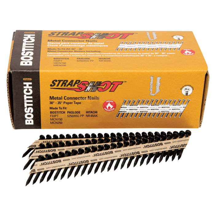Use 1-1/2" x .131 35° StrapShot paper collated metal connector nails with Bostitch tools F33PT, StrapShot MCN-150, StrapShot MCN-250.