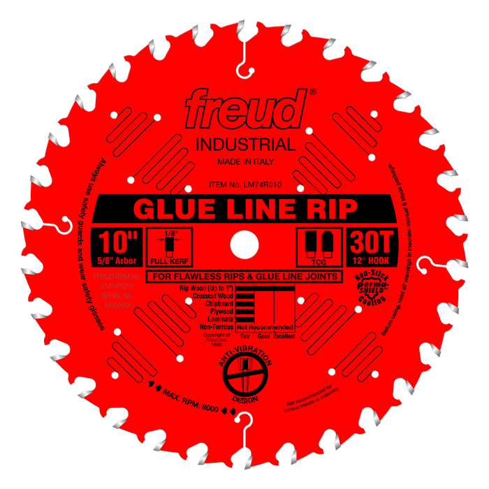 Specially designed triple chip grind (TCG) tooth design produces extremely smooth, glue line rips in hard and soft woods from 1/8" to 1" thick. Perma-Shield coating guarantees less working friction and less resin adhesion while preventing the development of rust.