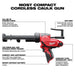 The M12 Caulk and Adhesive Gun is the lightest, most compact cordless powered caulk gun on the market today. With up to 400 lbs. of pushing force the M12 Caulk Gun easily dispenses everyday construction sealants and adhesives. The combination Variable Speed Trigger and Max-Speed dial allow for total application speed control. The 360 degree Rotating Collar delivers maximum control around turns. The tool also features auto-reversing anti-drip, a seal puncture tool and durable hang hook for versatility on the job.This configuration is designed to work with 10oz. cartridge style material containers. Milwaukee also offers accessory conversion kits to change to 20oz. sausage packs (48-08-0905) and Quart cartridges (48-08-0910).