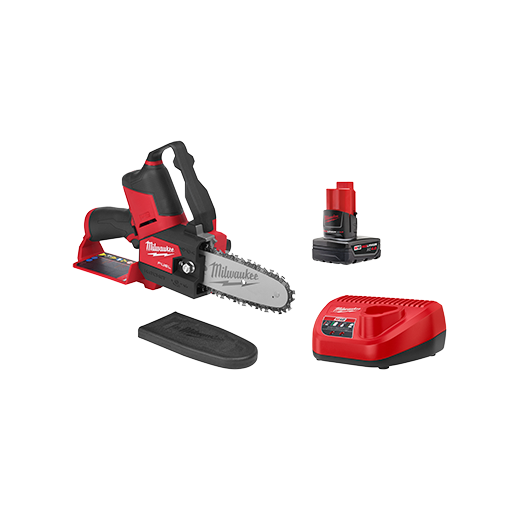 The M12 FUEL HATCHET 6" Pruning Saw Kit delivers unmatched control & access, has the power to cut 3" hardwoods, and delivers up to 120 cuts per charge. This electric pruning saw is designed to meet the ergonomic, performance, and durability needs of landscape maintenance professionals. Weighing less than 5 lbs and featuring a compact design, the cordless pruning saw gives you increased control and maneuverability in tight access areas. The POWERSTATE Brushless Motor delivers the power to complete cuts in demanding hardwood materials. The REDLINK PLUS Intelligence enables full-circle communication between the tool and battery, providing you with unmatched levels of performance, protection, and productivity. The advanced electronic package also delivers an instant throttle response and a variable speed trigger for ultimate control over the power range. The M12 REDLITHIUM XC 4.0Ah Battery delivers best in class run-time and performance. This pruning saw features a full house chain, easy access chain tensioner, automatic oiler, metal bucking spikes, and onboard storage for the scrench. The MILWAUKEE M12 FUEL HATCHET 6" Pruning Saw is part of the M12 System which is fully compatible with over 100 solutions.