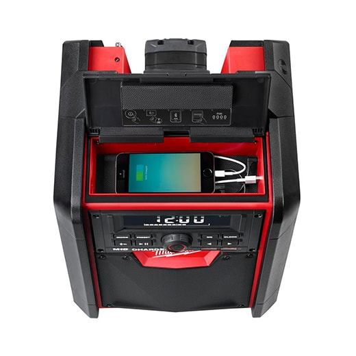 The Milwaukee M18 Jobsite Radio/Charger is the first charging radio to bring the power of Bluetooth to the jobsite, while delivering the industry's best reception and sound. The most advanced radio of its kind, the M18 Jobsite Radio/Charger features a Bluetooth receiver so you can stream rich, full sound wirelessly from over 100 feet away. Its unique battery charger allows you to charge any M18 battery without sacrificing reception or sound quality. For added versatility, a high-power USB port allows you to charge most portable electronic devices over 50% faster than any competitor. The M18 Radio/Charger's lightweight, high-strength design includes a reinforced roll cage for protection from weather and abusive jobsite conditions. The radio/charger also offers the industry's largest on-board, weather-sealed storage compartment to protect your small belongings and smart phones. A 16" auxiliary input cord and 2 AAA batteries are included.
