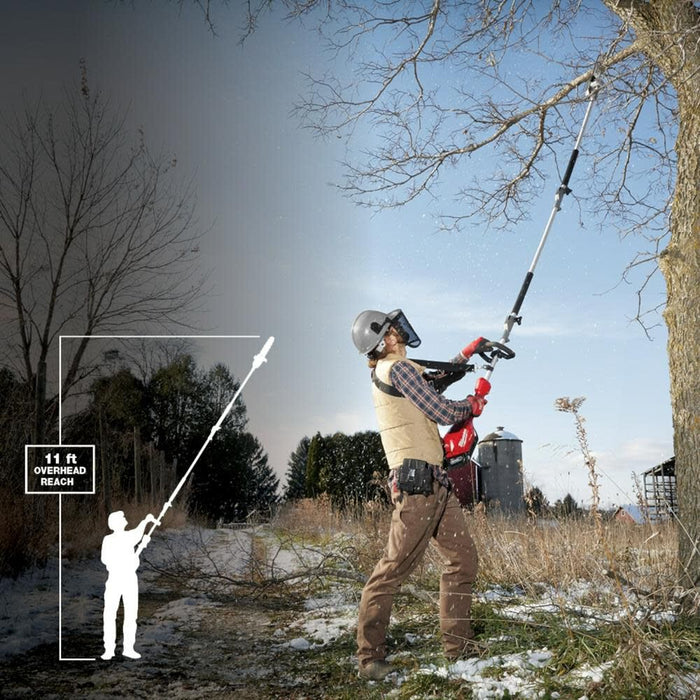 The M18 FUEL 10" Pole Saw w/ QUIK-LOK meets the needs of landscape maintenance professionals, giving them the power to cut hardwood branches, reach full throttle in under 1 second, and delivers up to 150 cuts per charge. The cordless pole saw features two components - the M18 FUEL Power Head w/ QUIK-LOK and QUIK-LOK 10Ó Pole Saw Attachment. This M18 FUEL Power Head, part of the MILWAUKEE M18 FUEL QUIK-LOK Attachment System, is compatible with multiple attachments such as an Edger, Articulating Hedge Trimmer, and String Trimmer attachment. You can quickly swap out attachments on a single Power Head, delivering ultimate versatility and a lower cost of ownership. The POWERSTATE Brushless Motor gives you the power to maintain its speed in demanding applications without bogging down, outperforming higher voltage systems. The motor is in the rear of the pole saw to provide the best combination of power, balance, and maneuverability. REDLINK PLUS intelligence gives you maximum performance and protection from overload, overheating, and over-discharge. The advanced electronic package also delivers instant throttle response and a variable speed trigger giving you ultimate control. The M18 REDLITHIUM HIGH OUTPUT XC8.0 Battery (sold separately) gives you best in class performance in all applications and delivers up to 150 cuts per charge. Our M18 FUEL 10" Pole Saw w/ QUIK-LOK is part of the M18 system, fully compatible with over 200 tools.
