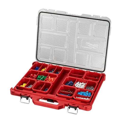 The Milwaukee PACKOUT low-profile organizer is constructed with impact resistant materials so it can withstand harsh jobsite environments. An IP65 rated weather seal protects your tools, accessories, and small parts from rain and other jobsite debris. The shallow organizer's interior features 10 removable storage bins with removable dividers. The transparent lid of the organizer seals the bins to prevent contents from migrating and shifting during transport. Heavy duty latches and reinforced hinges ensure that the slim organizer keeps the contents contained and protected.