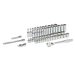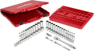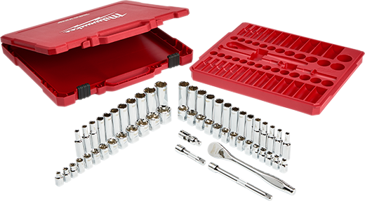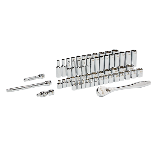 The Milwaukee SAE 56 piece 3/8" drive Ratchet & Socket set is designed from the ground up, offering our users the Most Versatile Sockets that are Anti-Roll and Wrench-Ready. Its innovative FOUR FLAT Sides feature an anti-roll and wrench-ready design. The 90 tooth ratchet tool offers 4 degree of arc swing and a slim profile design, allowing you to work in tighter and more confined spaces, be it under the hood of a car or in the middle of a remodel. The ratchet and socket kit comes with a removable inner tray which is perfectly designed to be stored long-term in a steel storage chest. All of our sockets are stamped with metric and SAE measurements on the flat side for easy-to-read visibility. It also comes with a durable carrying case for ultimate portability. The set comes with accessories included so that our users can get every job done, both in the garage and on the jobsite. Our ratchet and socket set is backed by our Lifetime Guarantee.