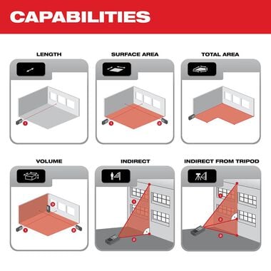Milwaukee 330' Laser Distance Meters are designed to provide the easiest measurements from all orientations, and feature an array of new functionality such as intuitive user interfaces, 3-position auto-detecting levers, and an industry-first digital auto-level. 2" color screens offer maximum visibility in low light conditions. Each features a simplified user interface that has been designed from the ground up for fast navigation so users can quickly choose their function and take a measurement with minimal downtime. Exclusive to the Milwaukee 330' Laser Distance Meter is the digital auto-level feature. This new functionality allows for a measurement to be automatically taken when the meter reaches a level position, increasing accuracy when measuring long distances. For additional ease of use, the 330' solution provides a 3-position auto-detecting lever that allows for measurements from corners and edges. Each 330' Laser Distance Meters offer several different measurement functions that allow users to add and subtract values and calculate linear distance, indirect height and length, surface area, total area, and volume. In addition, each tool includes memory storage for 30 readings and impact-resistant overmold for protection from tough jobsite conditions. Milwaukee Laser Distance Meters also feature a side shot button for an easier, more ergonomic experience when measuring in all directions.