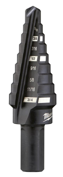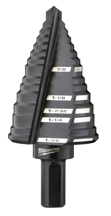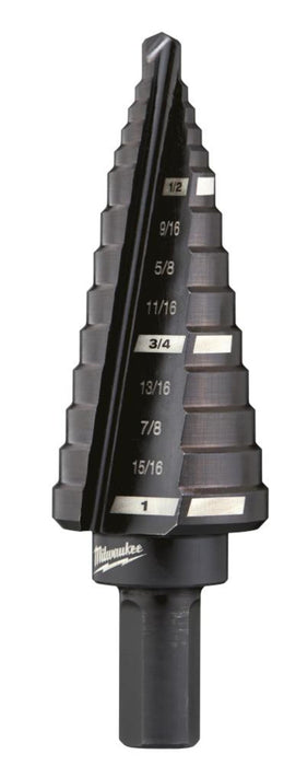 Milwaukee Step Drill Bits with JAM-FREE Performance feature a dual-flute design delivering up to 2X faster hole times, up to 4X longer life and up to 50% more holes per battery charge than competitors. Ideal for drilling small and large-diameter holes in steel and plastic, these bits are Optimized for Cordless Drills in High Speed. The Rapid Strike tip allows for a fast and accurate start that generates less heat, resulting in longer bit tip life. Black oxide coating also enhances durability, hole quality and bit life.For user convenience and accuracy, each bit has laser-engraved reference marks you can see while drilling. The 3-flat Secure-Grip shank ensures a solid connection with the drill chuck. The #1 Step Drill Bit has 13 hole sizes in 1/32" increments ranging from 1/8" to 1/2". Jam-Free Performance in high speed with most professional 18 volt cordless drills lithium-ion battery technology.