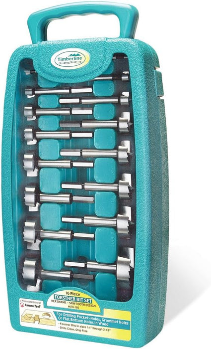 This 16-Piece Forstner Bit set with hex shank and saw tooth design comes in a heavy duty plastic handy storage and carrying case in all popular sizes from 1/4-Inch through 2-1/8-Inch in 1/8-Inch increments.