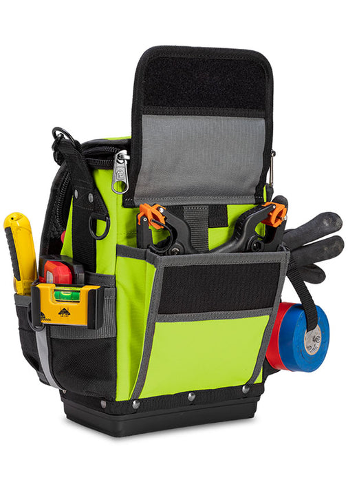 The TP-LC HI-VIZ YELLOW is a one-sided, closable large service technician tool pouch that can store meters, small hand tools, fasteners and wire nuts, etc. Featuring hi-visibility yellow fabric and reflective accents, the TP-LC HI-VIZ YELLOW is great for technicians needing a compact tool storage bag for keeping a variety of service-oriented tools out of the weather and protected. Features include an injection molded base, rugged construction, "Hang-up" hook, heavy duty zippers, and over-sized over-molded carrying handle.
